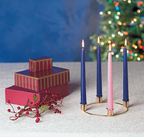 Included with this 7”-inch brass ring are four candles in a color combination of your choosing. We offer the traditional set of 3 purple candles and 1 rose candle to mark the four weeks of Advent, or you can instead opt to receive 4 matching purple candles.