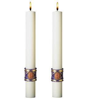 The term “Lilium” is taken from the Latin for “Lily” and represented by an intricate fleur-de-lis cross. Exquisitely adorned in royal blue with genuine gold leaf accents, this imagery is an ancient and regal symbol of the Holy Trinity. This Lilium candle reminds the faithful of the glorious divinity of the Father, Son, and Holy Spirit in one unified emblem.