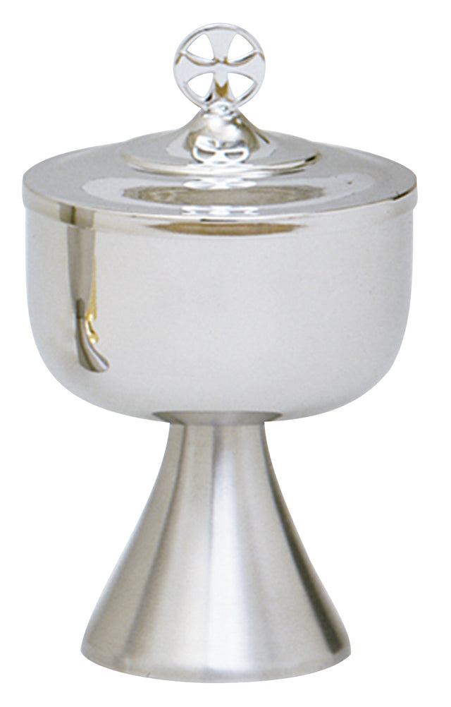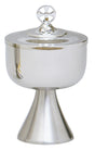 Stainless steel. Outside of cup and lid highly polished. Satin finish, 3˝ dia. base. 7-1⁄2˝H., 4-1⁄2˝ dia. cup, 400 host cap.