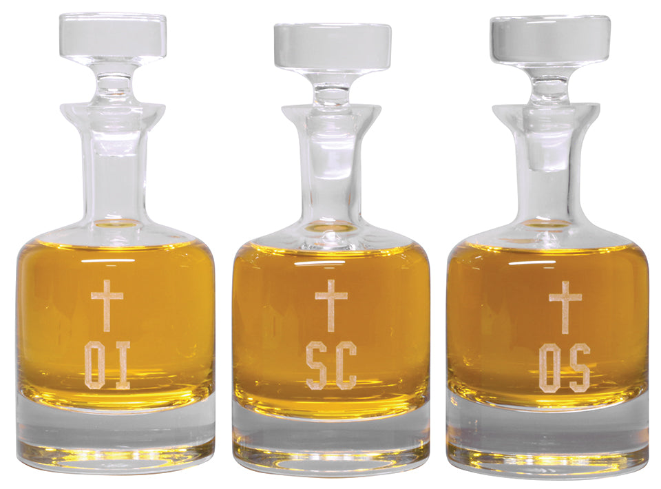 Ambry Set. Hand-cut imported crystal. Engraved OI, OS, SC. Also available in OC. 10-3/8˝H. including stopper. 4-5/8˝ dia. base, 28 oz. cap. Set of 3