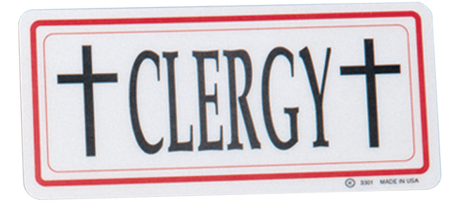 Clergy/Emergency Sign. Double-sided text with red border, 3-1⁄2˝ x 7-1⁄2˝. Quality made on heavy laminate. Complete with metal clip.