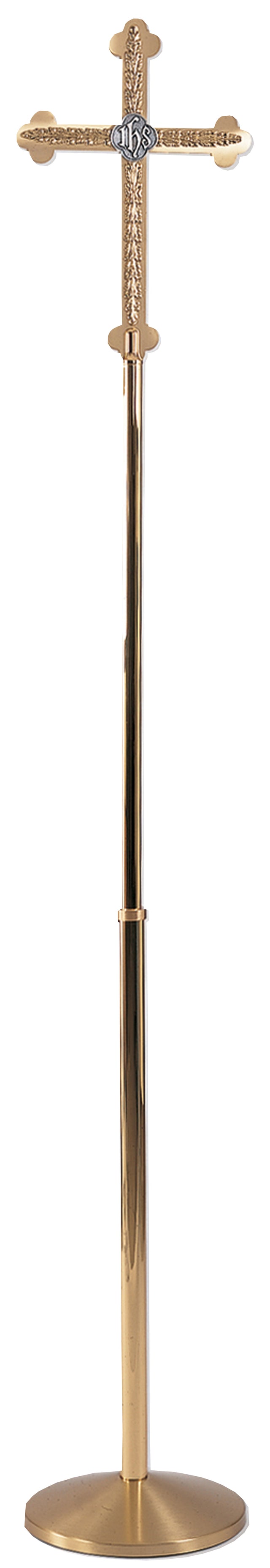 Cross with budded ends, filigree on face and oxidized silver ‘IHS’. Solid brass cross, two-tone brass finish. Breaks at node. 82˝H., 12˝ base, 13˝ x 18˝ cross. 44˝L. carry section, wt. 5 lbs.