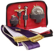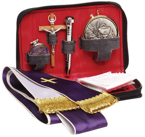 6 1/2" x 4 1/4" x 1 1/1" soft grey suede zipper case. 24k gold plated pyx (2" dia., 7 host cap.), 3 5/8" sprinkler, 1" dia. oil stock with ring, 3 1/8" H. crucifix, 53" x 2" stole, two cloths.