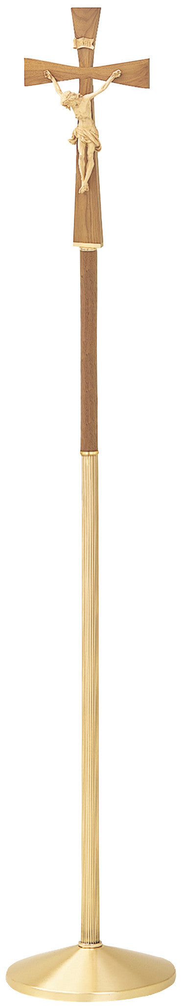 Satin Bronze. Feather weight for procession. 9" wood corpus carved in maplewood. 72"H., 11" x 20" walnut cross, walnut insert on staff. Removable at 10-1/2" base. Carry section wt. 4lbs.
