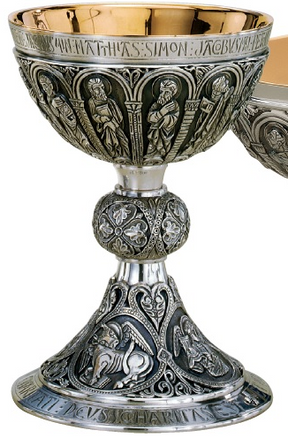 Romanesque chalice featuring the Twelve Apostles and their Latin names around the cup. The base featuring the symbols of the Four Evangelists.