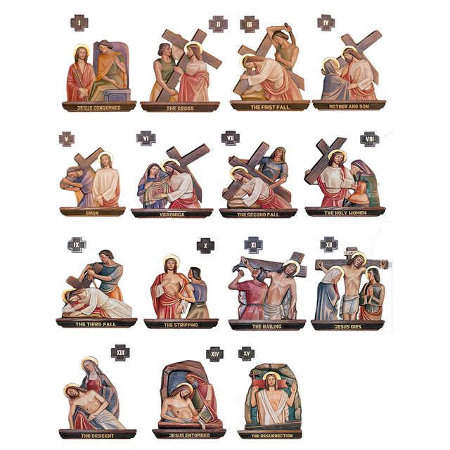 The #1324 Stations of the Cross are cast in fiberglass and lindenwood are offered in three sizes: