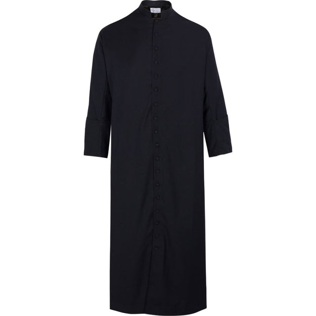 50% Polyester 50% Wool blend cassock. The wool blend adds breathability. Medium weight. Half lined, with padded shoulders and full cuffs.