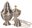 9˝ de altura, 5˝ de diámetro. cuenco. Bote: 51⁄2˝H., 41⁄4˝ cuenco. Incensario de 4 cadenas con barca en plata oxidada con cruz dorada sobre barca.