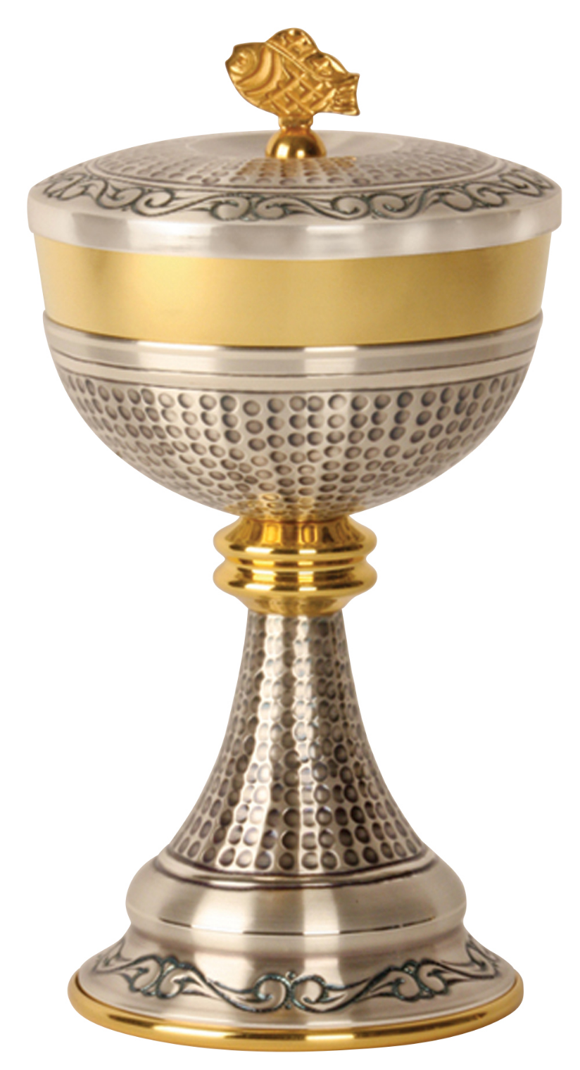 24k gold plated and oxidized silver. 4" base. 8 1/2" H., 4 3/8" dia. cup, 250 host cap.