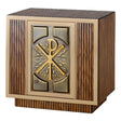 Toda la construcción de madera de roble con puerta de metal Chi-Rho, cerradura de gabinete, moldura de latón combinada, forro interior satinado.