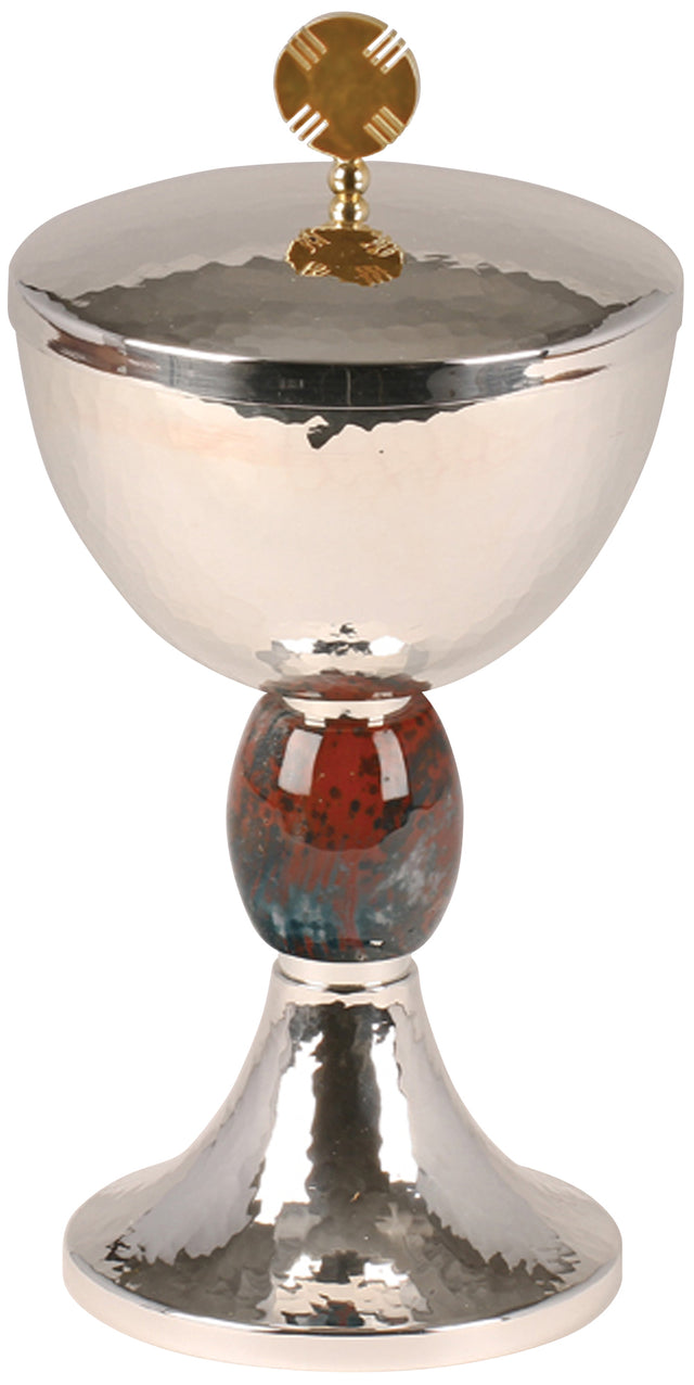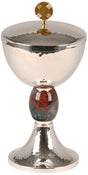 Baño de plata brillante con acabado martillado. Copa forrada en oro de 24k. Nodo de hematites real. 9-1⁄4˝ de altura, 4-3⁄4˝ de diámetro. taza., base de 4˝. Límite de 370 anfitriones.