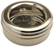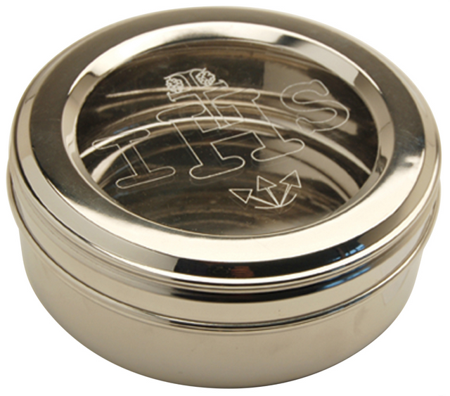 Nickel plated with IHS design engraved on cover. 6 3/4" dia., 2 3/4" deep.