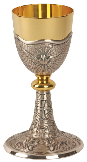 24k gold plated and oxidized silver with Holy Spirit and grapes with leaf design. 4 3/4" bases. 8 1/4" H., 3 1/2" dia. cup, 9 oz. cap.