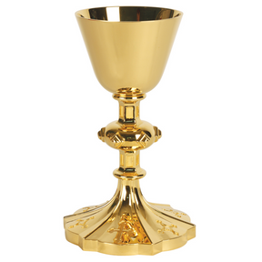 24k bright gold plated. Heavy cast stem, node and base. 5 1/2" base. 8 3/4" H., 4" dia. cup, 8 oz. cap.