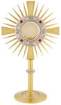 24k gold plated. Antique silver node and ring on base. Four ruby glass stones on face. 15 ¾" H., 5 ½" base. Holds 2 ¾" host.