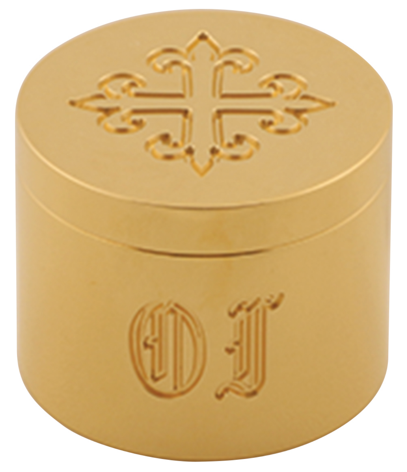 1 3/8" H., 1 11/16" dia. Solid brass. 24k bright gold plated. Engraved OI. Engraved cross on cover.