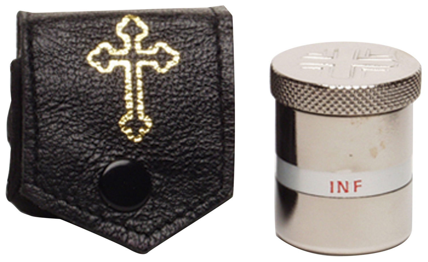 Nickel plated. 1 1/4" H., Marked INF. Leather case included.