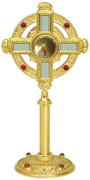 @4k gold plated. Center cross in silver finish. Eight ruby glass stones. 15" H., 6" base, wt. 3 lbs. Secure acrylic glass luna for 2 ¾" host.