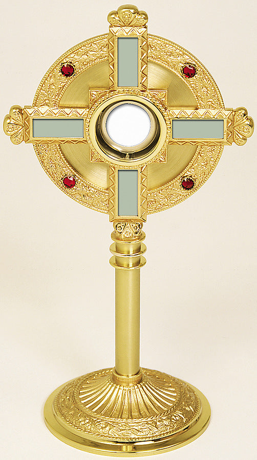 Enchapado en oro de 24k y plata oxidada con cuatro evangelistas en la cara. 18 1⁄2˝H., base de 6˝. Capacidad para hostias de 2 3⁄4˝.
