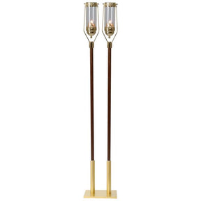 Chapado en latón con 1˝ de diámetro. eje de nogal macizo (el color y la veta pueden variar). 60˝H. general. Globo de vidrio de 3˝ x 8˝ incluido. Portavasos votivo de 10 horas. La antorcha siempre permanece en posición vertical sin importar el ángulo en que sostenga el eje.