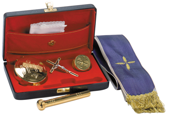 6" x 3 1/2" x 1 1/2" hard case. 24k gold plated pyx (2 1/8" dia., 7 host cap.), 1" dia. oil stock with ring, and 3 5/8" sprinkler. Crucifix, 65" reversible stole, two cloths.