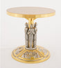Chapado en oro de 24k y plata antigua. Cuatro adoradores y cuatro relieves bíblicos en la base. 9 1⁄2˝ de altura, 9 1⁄2˝ de diámetro. mesa.