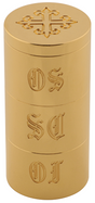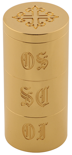 3 5/8" H., 1 11/16" dia. Solid brass. 24k bright gold plated. Engraved OI, OS, SC. Engraved cross on cover.