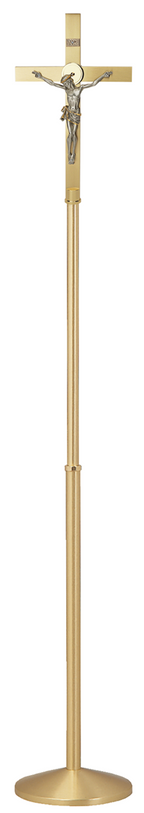 Solid brass, satin finish. 78" H., 12" base. 12" x 19" cross, oxidized silver corpus.