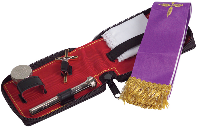 3 1/2" x 4 1/2" leather zipper case. 1" dia. oil stock with ring, 3 5/8" sprinkler, 2 1/8" H. crucifix, 66" x 2" reversible stole, purificator.