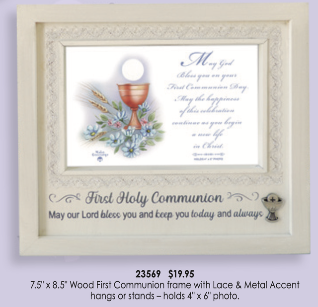 7.5" x 8.5" Wood First Communion frame with Lace & Metal Accent hangs or stands - holds 4" x 6" photo