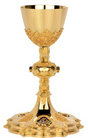 Traditional Gothic design of elegant style. Unique workmanship of the filigree technique, this piece has the poise of the chalices from the late XIX Century. The three medallions on the base are top notch representations of the Crucifixion, St Joseph, Child Jesus, and the Virgin Mary, all featuring the best fire enamel work available in the market.