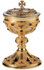 Modeled after the famous St. Remy chalice, housed in the Cathedral of Reims (France).  Fully handcrafted construction including set precious stones & fire enamel work.