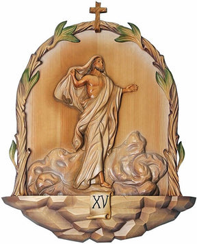 Estaciones de la cruz de madera, estilo barroco Las estaciones de la cruz intrincadamente talladas a mano incluyen detalles finos en cada relieve y están terminadas a mano con tonos cálidos y suaves de tintado. El diseño de rama de olivo tallado a mano y el camino de roca enmarcan cada estación bellamente y reflejan el estilo barroco. Cada estación tiene una cruz de madera rugosa y un número romano. Dado que cada pieza está tallada y terminada a mano, habrá ligeras variaciones artísticas en cada conjunto creado. Tallado en madera de tilo. 26˝H. x 20 1⁄2˝ W. Importado de Europa. Conjunto de 14 estaciones
