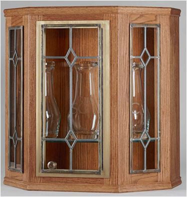 Vidrio transparente emplomado biselado en puerta y dos paneles laterales. Fabricada en Contrachapado de Roble con acabado claro. Estante de vidrio ajustable en el interior. Tamaño: 25" pulgadas de altura, 24-1/2" pulgadas de ancho y 10-1/2" pulgadas de profundidad. Interior iluminado.