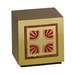 Toda la construcción de madera, cubierta con latón, cerradura de gabinete. Acabado: paneles de bronce satinado, decoración frontal de esmalte rojo y forro de tela satinada.