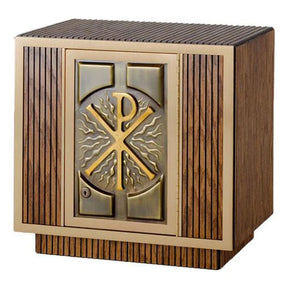 Toda la construcción de madera de roble con puerta de metal Chi-Rho, cerradura de gabinete, moldura de latón combinada, forro interior satinado.