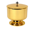 7 3/4" height, 7 3/4" dia., high polish finis outside, 24k gold plated inside, with base. Holds 1200 hosts, 1 3/8" size. Bright polished inside.