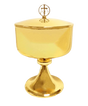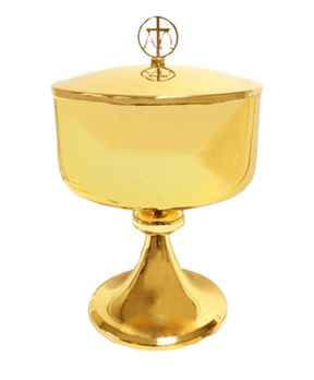 15" height, 10" dia., high polish finish outside, 24k gold plated inside, with base. Holds 2000 hosts, 1 3/8" size. Bright polished inside.
