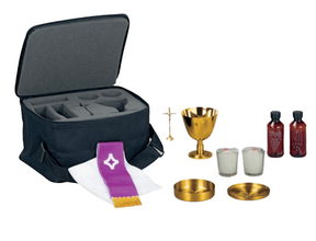 Soft side case 11 1/2" x 9" x 6" with die-cut super-foam inside. Includes 4 1/2" tall 24k gold plated chalice, one combination paten/host box (paten serves as lid for host box), a pair of votive glass candlesticks, one standing crucifix, one each water and wine bottle. Includes priest's stole and altar linen.