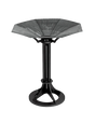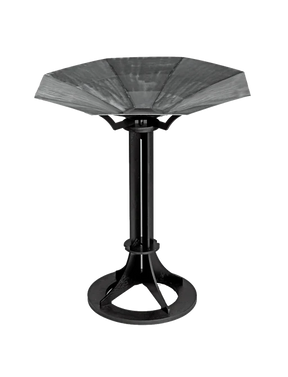 39" height, 34" diameter, brushed stainless steel bowl, welded seams, 18" base, matte black finish on stand.