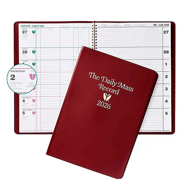 The Daily Mass Record Book for 2026 includes 14 months of record-keeping ability. The dated entries extend from the 1st Sunday of Advent through January of the following year. The 2026 DMR is available now, bound in a resplendent red cover!