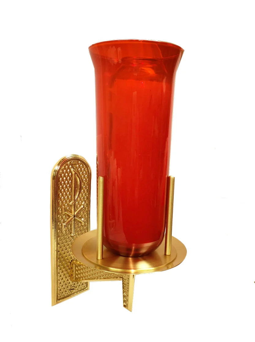 8" projection from wall, 9 1/2" high, glas not included. Cast brass with diamond & Chi-Rho pattern, bright polished finish.
