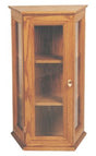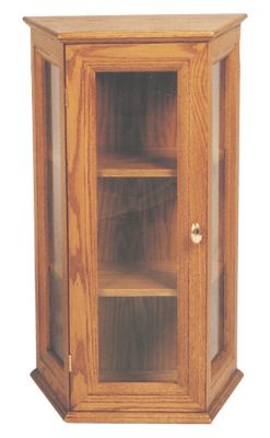 Oak w/glass panels and adjustable wood or glass shelves, w/a brass lock.