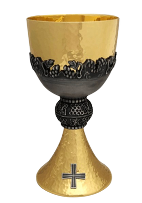 7" height, 4" cup dia., holds 16 oz. All bright polish 24k gold plated, hammered finish. Cast brass metal grape outer cup in silver oxidized finish.